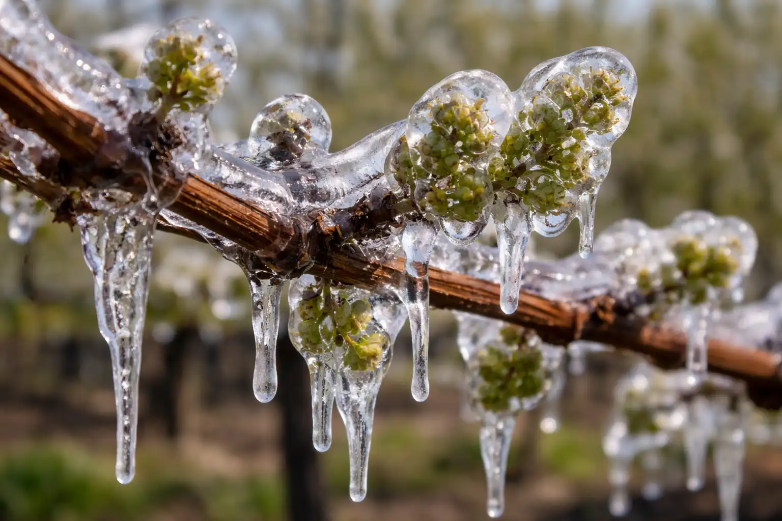 Hovedårsagen til manglende bær er skader central knop. Druer kan frigive erstatningsknopper, men de er for det meste ufrugtbare. For at undgå dette bruger jeg “isskal”-metoden eller Kryobeskyttende vanding. Ideen er at få vandet til at fryse på vinstokken og frigive latent varmeenergi, som forhindrer vævet indeni i at køle ned til et kritisk punkt.