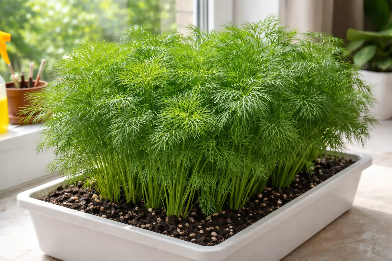 Den vigtigste hemmelighed bag succes er ikke at så dild i dybe potter. Dens rodsystem er overfladisk, så i brede og lave bakker fordeles fugten jævnt, hvilket udelukker, at der opstår skimmel i bunden af stænglen.