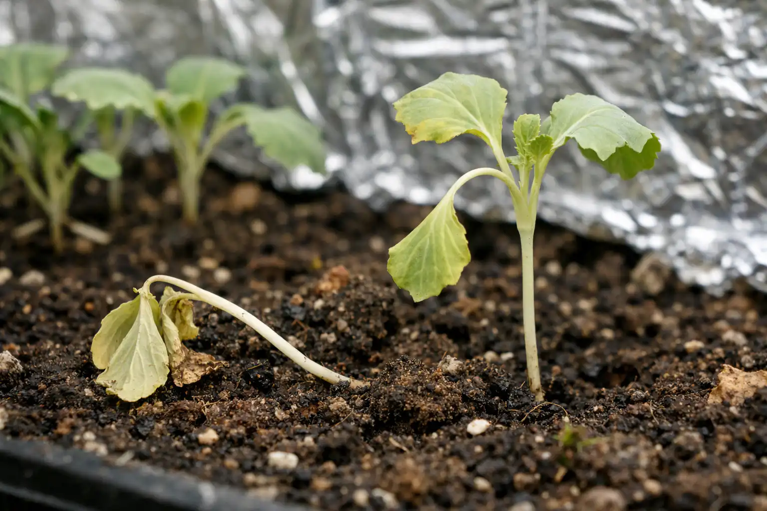 Når kimplanter mangler lysenergi, begynder de at bruge alle deres næringsreserver på opadgående vækst i forsøget på at “nå” solen. Resultatet rodhals bliver tyndere, blodkarrene bliver indsnævret, og bladene har ikke længere adgang til fugt. Planten visner ikke på grund af mangel på vand i jorden, men på grund af dens manglende evne til at absorbere det.