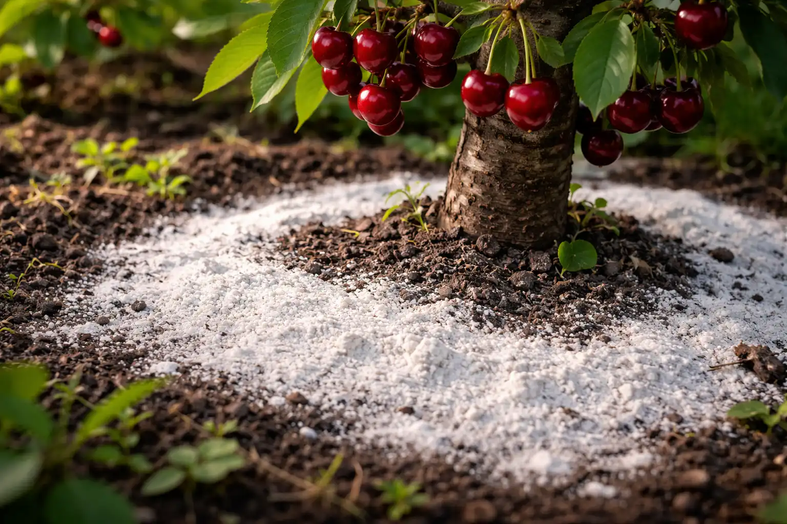 Ved at afoxidere jorden om foråret kan kirsebærrene maksimere optagelsen af kvælstof og kalium fra andre gødninger. I et surt miljø bliver det meste gødning simpelthen blokeret og når ikke frem til træets karsystem. Efter kalkning vil du bemærke, hvordan barken bliver renereog den årlige vækst af grene øges med halvanden gang.