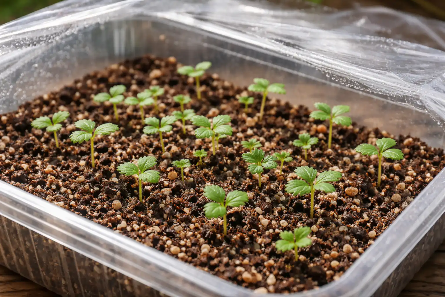Beholderen dækkes med en gennemsigtig film for at skabe en drivhuseffekt.
