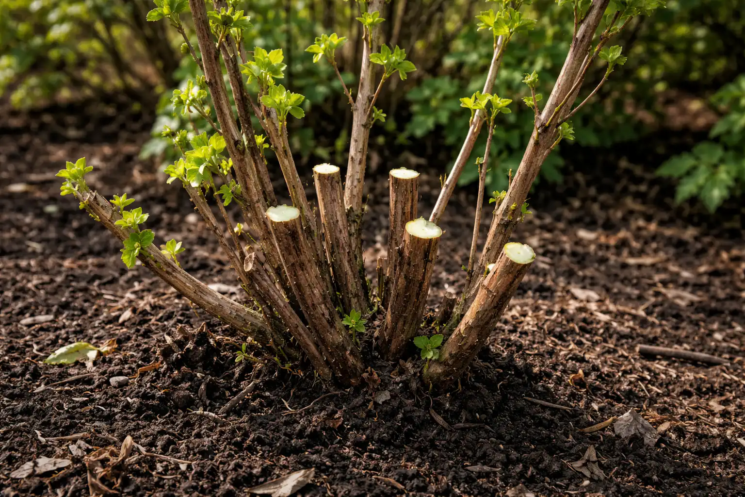 Fjern gamle skud så lavt som muligt, ved jordoverfladen, uden at efterlade stubbe, der kan blive grobund for infektion.