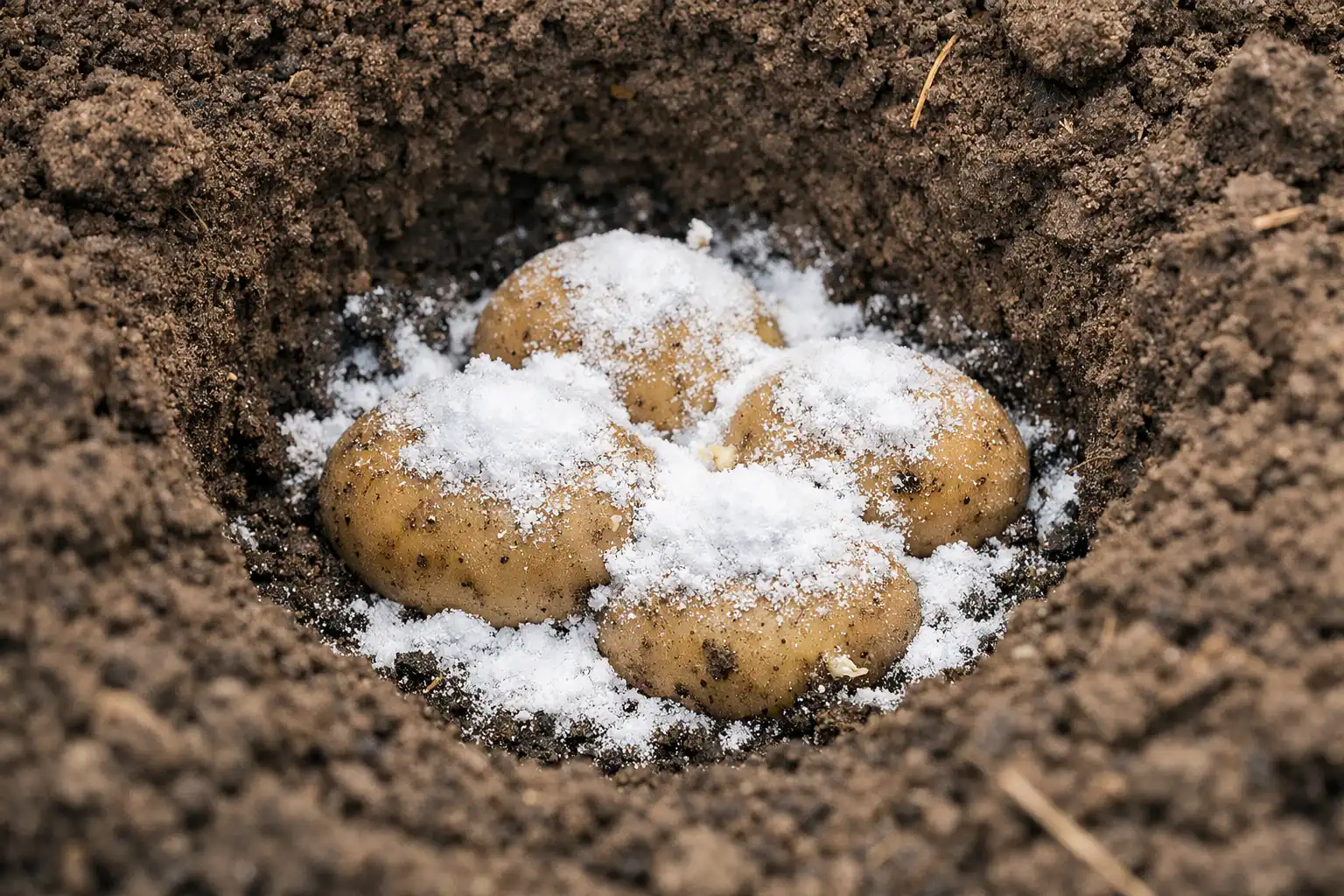 Hemmelig nuance: Hæld aldrig bagepulver “ved øjet” direkte på knolden. For at undgå at brænde de spæde spirer skal du blande det med tørt sand eller træaske i forholdet en til en. Det vil skabe en blød, beskyttende hinde omkring kartoflen.