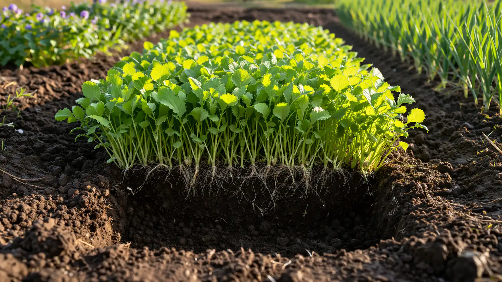 Den største fordel ved tidlig såning er ukrudtsbekæmpelse. Mens dyrkede planter stadig sygner hen i vindueskarmen i form af kimplanter, sennep eller rapsfrø indtager allerede området og efterlader ingen chance for hvedegræs eller svane.