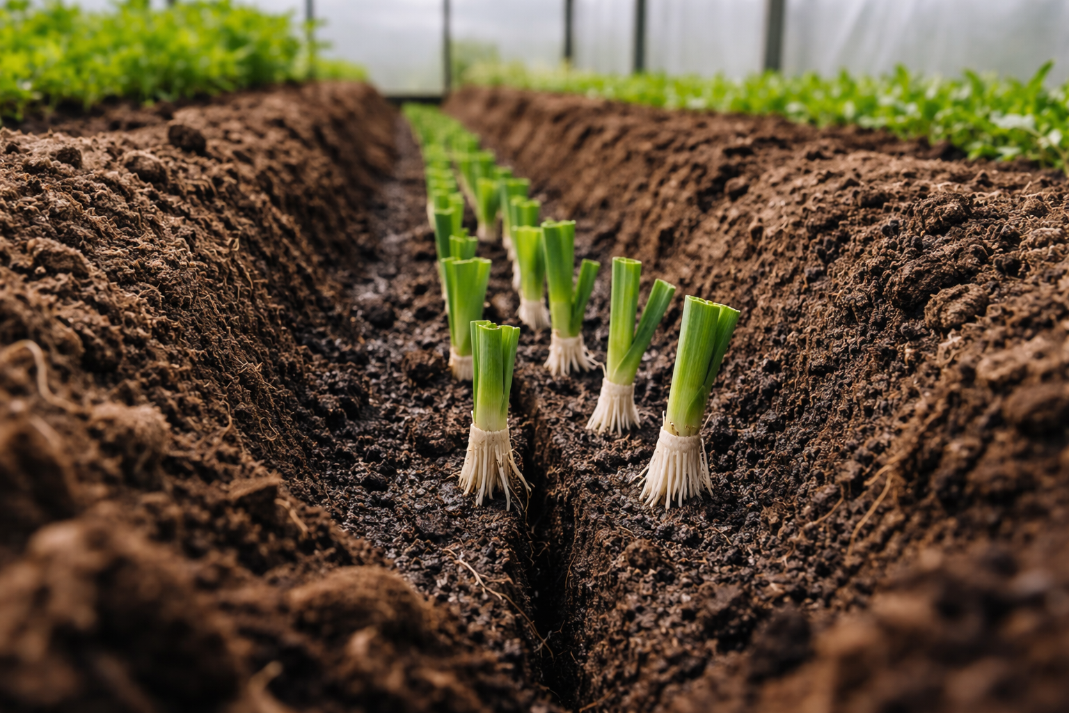Porrer har brug for et løst substrat med et højt organisk indhold for at få masse. Jorden varmes hurtigere op i drivhuset, men den er ofte tør efter vinteren. Sørg for at vande bedene med varmt vand, før du planter.