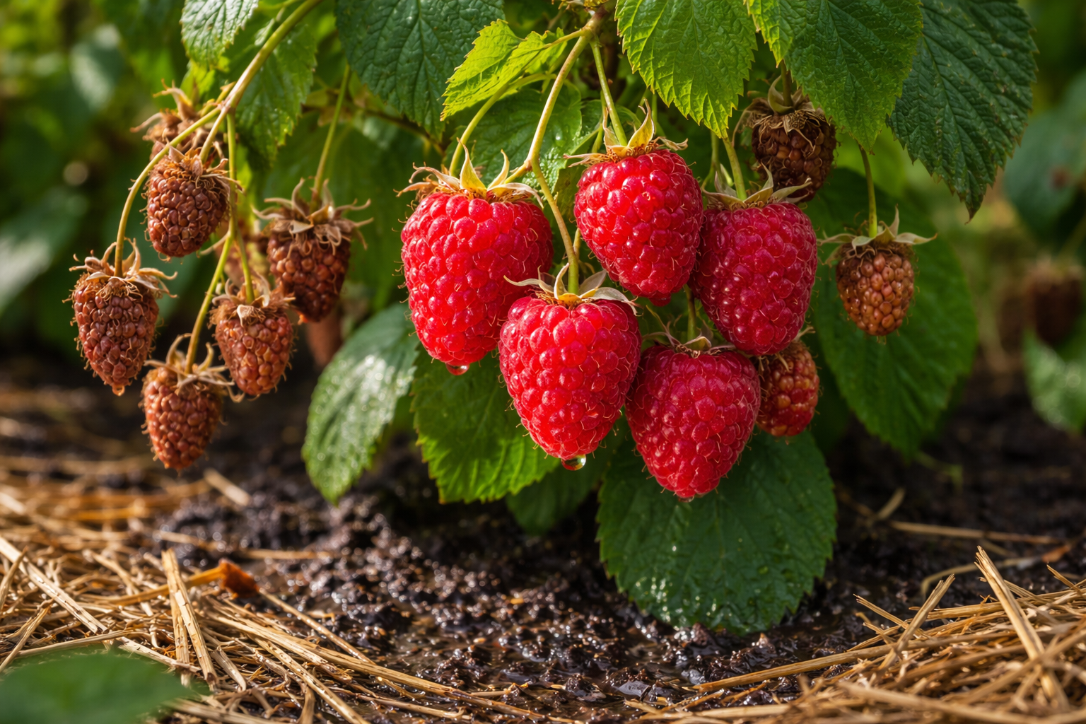 Hindbærrenes rodsystem er placeret i de øverste jordlag, så de er de første, der lider under udtørring. Når varmen kommer, begynder planten at fordampe fugt gennem bladene dobbelt så hurtigt, som den kan optage den fra jorden.