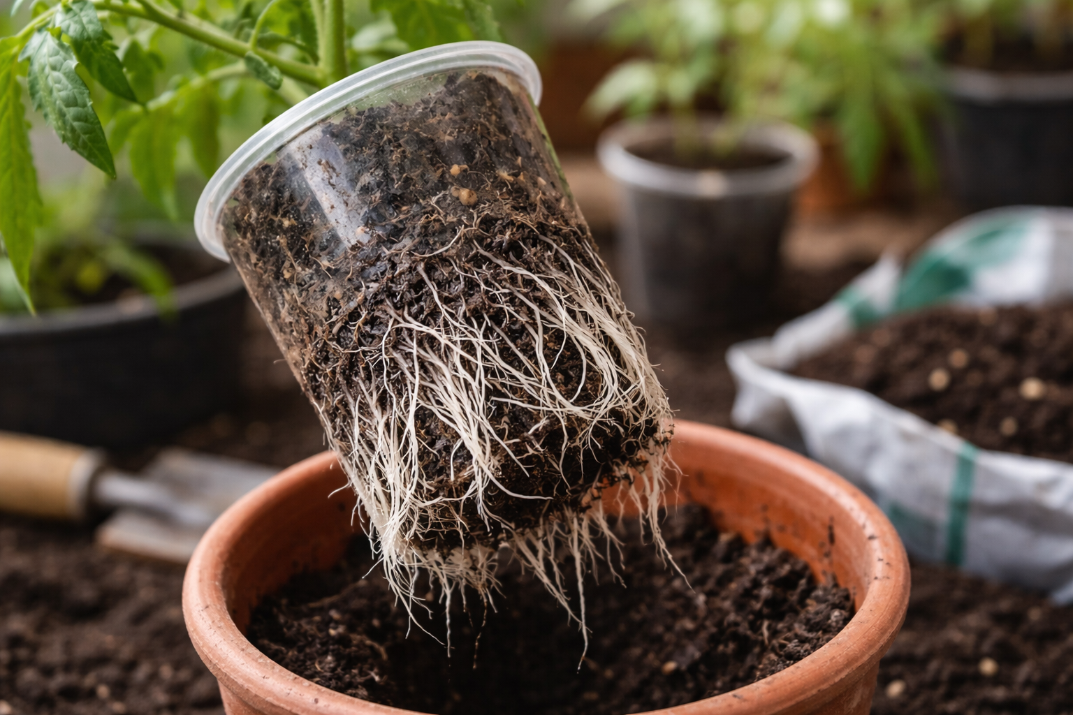 Når tomatrødderne fylder hele koppens volumen, begynder de at undertrykke hinanden. Planten indser, at der ikke er ressourcer nok til at få hele massen til at vokse, og begynder at “smide ballasten”. Den tager mobile næringsstoffer fra de gamle nedre blade og omdirigerer dem til vækstpunktet.