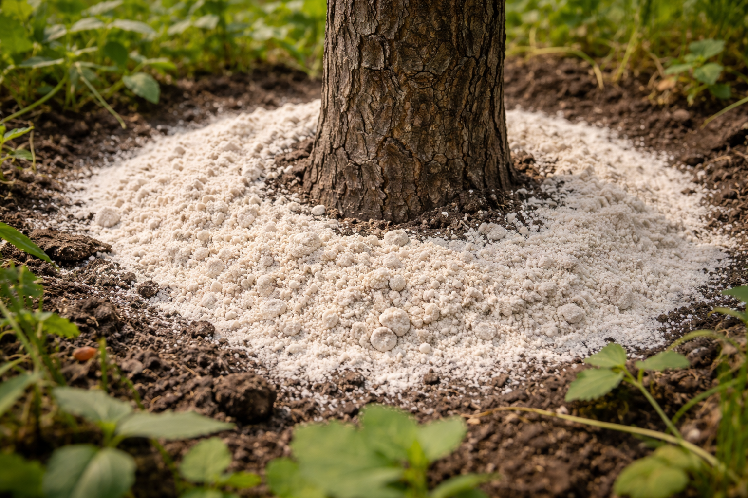 – Spred pulveret over kronens fremspring, ikke kun ved stammen. – Sørg for at indarbejde tilsætningsstoffet i jorden i en dybde på fem til ti centimeter. – Stænk jorden med vand efter påføring for at aktivere processerne.