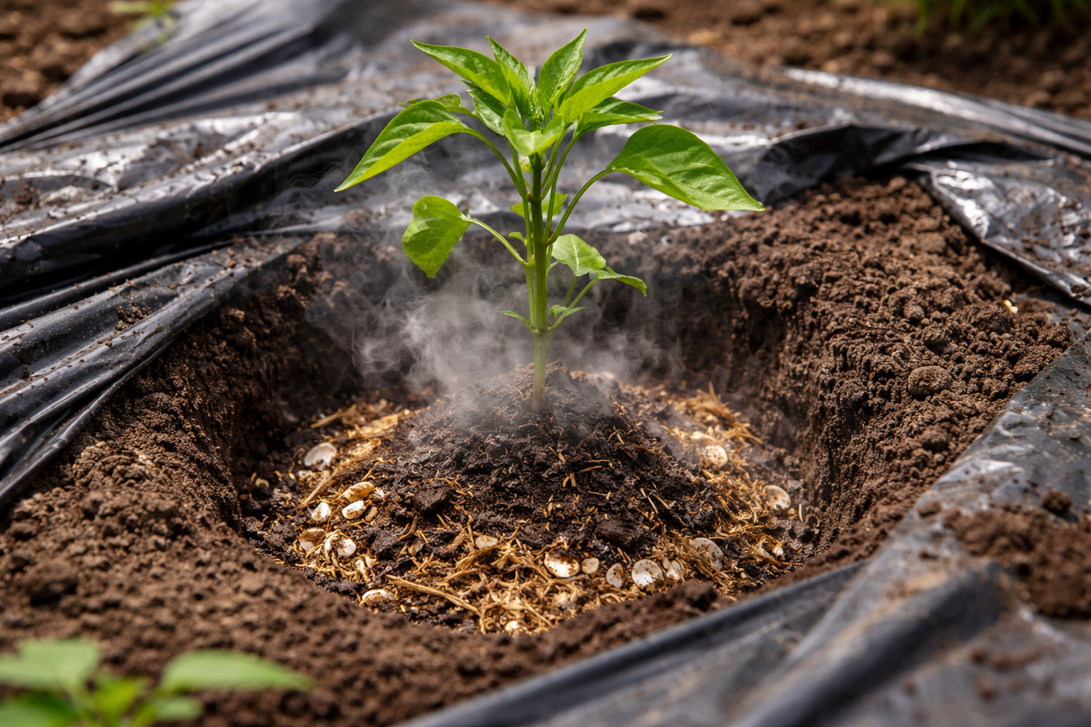 For at varme sengen hurtigt op bruger jeg “hot hole”-metoden og sort barkflisfilm. Det giver dig mulighed for at plante kimplanter 10 dage tidligere end normalt.