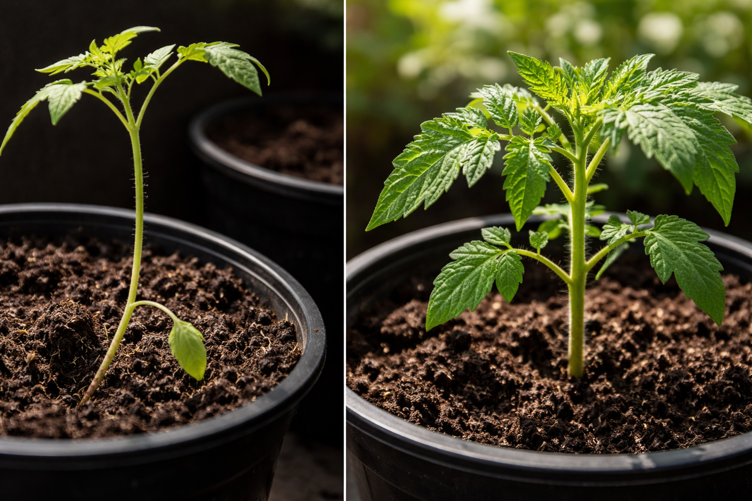 Tomater er planter med en ekstremt høj tærskel for lysfølsomhed. Når lysintensitet falder, udløses en overlevelsesmekanisme: Planten bruger alle sine ressourcer på opadgående vækst for at “finde vej” til solen gennem imaginære konkurrenter. Resultatet er en lang internode og en tom stængel.