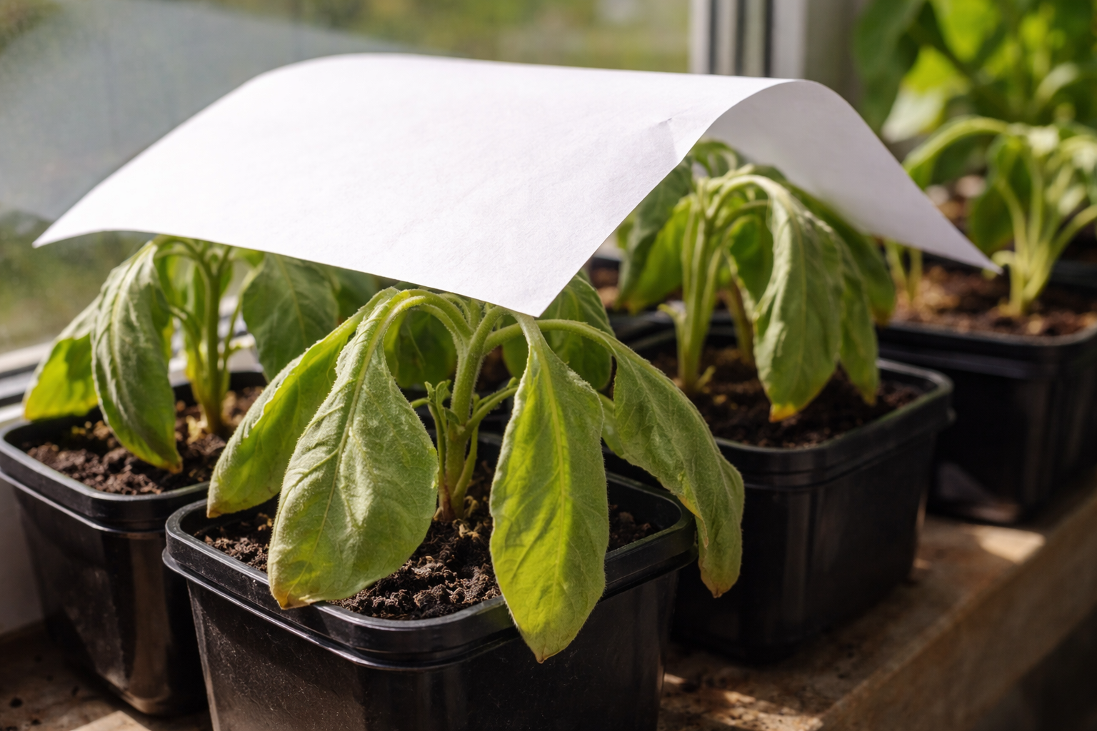 – Auberginer hader træk i stærkt sollys. – Direkte stråler gennem glasset virker som en linse. – Tørvepotter i solen tørrer ud med det samme og trækker fugt ud af rødderne. – Mangel på jordvolumen får planten til at “give op” i løbet af et par timers varme.