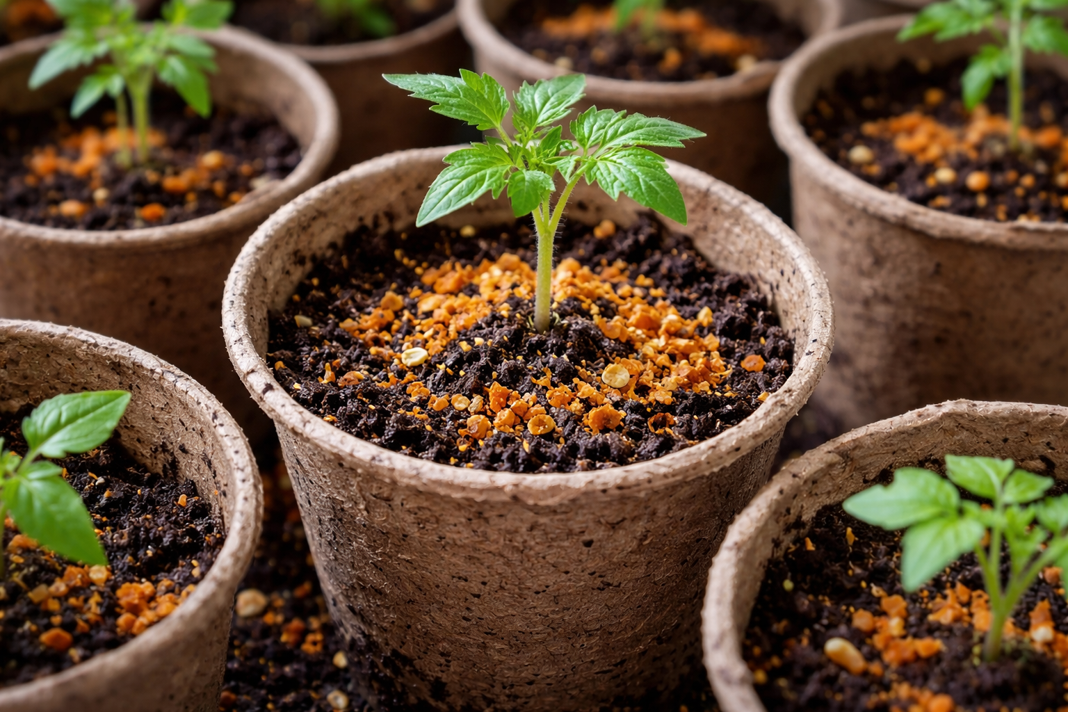 Appelsinskaller indeholder et unikt sæt af æteriske olier, fosfor, kalium и kvælstof. Men deres største værdi ligger i deres evne til at afskrække små skadedyr og strukturere jorden. Når de nedbrydes, skaber de organiske citrusfrugter et surt miljø, som tomater og peberfrugter elsker i deres tidlige udviklingsstadier.